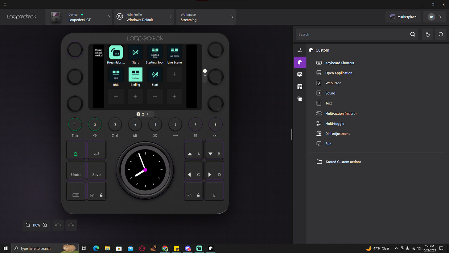 In an earlier newsletter, I alluded to doing a tutorial on how to use Streamlabs with a Loupedeck. The Loupedeck I’ll be using for this tutorial is the CT. It’s the one with the dial. I really like using any macro keyboard to stream. This setup between these two streaming applications is great if your setup is smaller. Mine currently is while I’m readjusting. Instead of three monitors, I have one with my limited desk space it’s a good choice. I really can only fit the keyboard, a mouse, and a macro keyboard – my Loupedeck. Let’s get started.